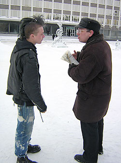 Шествие намечено было начать со сбора на Стефановской площади. Но еще раньше участников акции на площади собрались внушительные силы правопорядка: наряд патрульно-постовой службы, экипаж ГИБДД и целый автобус с бойцами ОМОНа, который припарковался неподалеку от Желтого дома. Но и коммунисты получили неожиданную поддержку в лице правозащитника, председателя Коми комиссии «Мемориал» Игоря Сажина. Появившись на площади, он тут же стал обсуждать с секретарем горкома РКРП-РПК Александром Вербиным, кого можно считать политузниками, а кого нельзя. Открыв принесенную брошюрку, г-н Вербин стал зачитывать список жертв. Оказалось, что участники акции расходятся во мнениях. Г-н Сажин настаивал на том, что в список современных политзаключенных надо обязательно внести Михаила Ходорковского, к примеру. Александр Вербин вроде против этого не возражал, но в ходе шествия ни разу о Ходорковском не вспомнил. После того, как на площадь пришли республиканские коммунистические лидеры Владимир Лапшин (с пачкой листовок) и Леонид Мусинов (с транспарантами и знаменами партии), до двух десятков собравшихся довели информацию о том, как преследуют людей за их убеждения в России, Молдавии, на Украине и даже в Испании. Пока Александр Вербин зачитывал выдержки из все той же вышеупомянутой книжечки, к протестующим примкнул странный гражданин. Через какое-то время он обратился к Игорю Сажину с просьбой помочь с составлением иска в Страсбургский суд по правам человека. Гражданин не стал представляться, а лишь пояснил, что он – донор. С его слов выходило, что государство задолжало ему. В ходе разговора «донор» достал из пакета «случайно оказавшуюся с собой видеокамеру» и сказал, что ему надо снять панораму. Для нужной ему панорамы он поставил Игоря Сажина перед участниками акции и попросил наговорить в объектив, с какой целью все здесь сегодня собрались. Правозащитник наговорил. Засняв всех участников, «донор» исчез так же внезапно, как и появился. Минут через десять, когда митингующие выстроились в нестройные ряды и двинулись к зданию, в котором располагается Госсовет РК, на площади появились двое крепких на вид мужчин. Один из них неумело пытался прятать под полой куртки небольшую цифровую видеокамеру, второй его прикрывал. Сначала «видеолюбители» вели съемку из-за угла здания, потом они перестали прятаться и снимали, уже не таясь. В это время по площади проходил панк. Поравнявшись с участниками акции, он что-то буркнул в их адрес. Панка умело обработали Владимир Лапшин и Леонид Мусинов. Объяснив, что «они стоят здесь против власти», коммунисты спросили юношу, как к власти относится он сам. Подумав, панк озадаченно спросил: «Выходит, мы с вами заодно?» После чего присоединился к участникам шествия. Между тем милиционеры выстроились на ступеньках госсоветовского здания цепью. «Сыночки, – крикнули им бабули-участницы шествия, – давайте в наши ряды». Весьма продрогшие к тому времени стражи порядка были подчеркнуто вежливы и в ответ лишь благодарили митингующих за приглашение. А те, осмелев, раздали милиционерам листовки, а на словах наказали стражам порядка: «Обратите внимание, там одного прямо в камере насмерть запытали». На все вопросы, зачем они здесь собрались в таком количестве, милиционеры отвечали, что за тем, чтобы в случае чего защитить митингующи