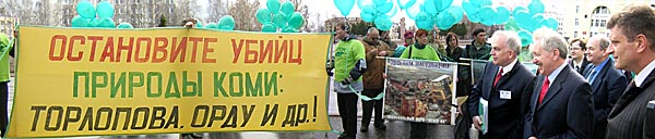 Владимир Торлопов поблагодарил “зеленых” за пиарВ минувший четверг, 21 апреля, активисты Коми правозащитной комиссии «Мемориал» и Коми республиканского общественного комитета (КРОК) «Охрана природы» пикетировали здание Госсовета РК, где в этот день начал свою работу I Cеверный социально-экологический конгресс «Культурная и природная палитра Северных территорий России». Экологи-общественники вышли на Стефановскую площадь Сыктывкара менее чем за час до начала конгресса – в тот момент, когда к госсовету съезжались многочисленные участники форума. Вылезая из автобусов и автомобилей, гости первым делом обращали внимание на плакат (размером полтора на четыре метра) «Остановите убийц природы Коми: Торлопова, Орду и др.!». «Многообещающее начало», – бормотали про себя приезжие участники конгресса и, достав из портфелей камеры, с удовольствием фотографировали участников акции, а затем самих себя на фоне пикета. Организаторы акции хотели проинформировать участников конгресса об антиэкологических решениях властей Коми. Особое внимание пикетчики уделили тому, что руководство республики изменило границы Национального парка «Югыд ва» с целью возобновления добычи золота на Приполярном Урале. (За пару дней до начала конгресса организаторы акции собрали более тысячи подписей сыктывкарцев в поддержку целостности национального парка.) Помимо этого, защитники природы протестовали против незаконного строительства в Сосногорском районе за счет средств республиканского бюджета автодороги к месту предполагаемого размещения глиноземного завода группы «СУАЛ». Минут за десять до того, как природоохранники появились на Стефановской площади, на всех подступах к ней были расставлены милицейские автомобили. Рядом со зданием госсовета припарковался автобус с бойцами ОМОНа. Милиция была готова дать любой отпор и в случае чего противостоять антиобщественным настроениям. Однако пикетчики были настроены вполне миролюбиво. После того, как более трех десятков демонстрантов появились возле здания госсовета, заместитель начальника милиции общественной безопасности УВД Сыктывкара Олег Терентьев попытался «подкорректировать» акцию, отодвинув пикетчиков подальше от тротуара. «Тротуар перед входом в госсовет не является частью Стефановской, а вам разрешено проводить акцию только на площади», – попытался было объяснить логику своих действий г-н Терентьев. Демонстранты послушно отодвинулись на пару метров, однако оказалось, что теперь они загородили автодорогу, по которой проезжает правительственный транспорт. Однако еще дальше, как того требовала милиция, пикетчики уходить не пожелали. Первым из чиновников плакат об «убийцах природы» увидел министр природных ресурсов и охраны окружающей среды РК Александр Боровинских. Как признался позже «ЗЖ» один из организаторов акции, фамилия министра должна была значиться на плакате «зеленых» сразу вслед за фамилией Орды. Однако устроители решили уменьшить размеры плаката и поэтому места для фамилии министра на полотнище не нашлось. Пикетчики ограничились тем, что вручили министру пакет своих требований. Г-н Боровинских пакет взял, а затем остановился на ступеньках госсовета и стал обсуждать действия пикетчиков с подошедшим руководителем управления Росприроднадзора по РК Александром П
