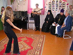 Вообще, «лагерный» сезон-2005 пока не закрыт: православному лагерю в Визябоже до конца этого лета осталось принять еще две смены. Всего же в нынешнем сезоне на живописном берегу Вычегды смогут отдохнуть более 300 ребят из Коми, в основном – воспитанники воскресных школ, а также дети из малообеспеченных и многодетных семей. Стоимость путевки в визябожский православный лагерь чисто символическая – 1100 руб. При этом, со слов персонала, часть затрат на поддержание лагеря берут на себя состоятельные родители. За 12 дней закрывшейся в минувшую пятницу четвертой смены в Визябоже отдохнули 52 человека. Так случилось, что открытие этой смены совпало с трагедией в Ухте, а большинство воспитанников православного лагеря оказались ухтинцами. Концерт для гостей в честь закрытия четвертой смены был прерван минутой молчания в память жертв ухтинской трагедии. Днем 22 июля воспитанники православного лагеря в ожидании высоких гостей репетировали приветствия в двух вариантах. Один – для епископа Сыктывкарского и Воркутинского Питирима («Здравия желаем, ваше преосвященство!»), другой – для Главы РК Владимира Торлопова («Главе Республики Коми – троекратное «ура!»). Пока воспитанники репетировали, секретарь епархиального управления о. Филипп (Филиппов) объяснял представителям СМИ, зачем в православный лагерь едет светское начальство. Оказывается, «тем самым руководитель республики подчеркивает свое отношение и к детям, и к православию, поэтому мы так торжественно его встречаем». Когда игумена Филиппа спросили, а не слишком ли армейская дисциплина установлена в лагере («все эти построения, равнения, приветствия»), он заявил: «Вы знаете, армия и церковь всегда были близки. Устав церковный немножечко напоминает военный устав. И только благодаря вот такому жесткому уставу церковь выстояла». В это время к воротам лагеря подъехала черная «Волга» с Владыкой Питиримом. Дети, в спешном порядке построенные в неровную шеренгу, в суматохе выдали: «Епископу Сыктывкарскому и Воркутинскому – троекратное «ура!» Но тут же поправились и поприветствовали епископа по всем правилам. Владыка снисходительно улыбнулся. Обойдя строй, он благословил каждого воспитанника. «Ну, теперь вы так же и главу республики поприветствуйте, – подсказал епископ Питирим. – Только – ваше превосходительство...» Дети так и сделали, чем явно смутили «его превосходительство» Владимира Торлопова, приехавшего в лагерь в сопровождении свиты. Глава не знал, как реагировать: «Мне «вольно» надо сказать или что?» «Ничего», – вдруг вставил какой-то смельчак. «Понял, – не растерялся глава. – Ну, что, пошли дальше? Что там у нас по программе? Концерт? Петь будете?» «Так точно!» – прокричали дети. Высокие гости в сопровождении детей проследовали в актовый зал главного корпуса, на стенах которого мирно соседствовали портреты епископа Питирима и поп-звезды Маши Распутиной. Концерт начался с гимна Визябожу: А у нас собака Умка, А у нас индюк Угрюмка... А у нас есть поросята и свинья. А у нас картошка вкусная своя... Следом прозвучала композиция, восхваляющая природные богатства Республики Коми и персонально – ее главу. По ходу исполнения воспитанники лагеря неожиданно предложили главе в песенной форме эти «богатства продать», а вырученные деньги «на нужды православия передать». Г-на Торлопова, судя по 
