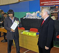 Между тем президентом федерации глава оказался совсем неслучайно. Тренером и судьей по «рукопашке» давно работает его помощник Александр Жданов. Сейчас г-н Жданов занимает в республиканской федерации должность вице-президента. На открытии турнира г-ну Торлопову вручили благодарственный диплом за вклад в развитие рукопашных единоборств от президента российской федерации рукопашного боя. Глава продолжил вносить лепту в развитие своего вида спорта, сообщив, какие соревнования здесь еще предполагается провести. Сама церемония с участием главы продлилась минут 15. За это время г-н Торлопов успел отсмотреть шоу-программы – физкультурно-танцевальный номер и показательное выступление молодых разнополых борцов. После этого он со своим окружением, в котором оказались и.о. министра внутренних дел РК Владимир Силаев, руководитель Агентства РК по физкультуре и спорту Алексей Дружинин и др., удалился куда-то в служебные кабинеты Спортивно-культурного центра. В призах для спортсменов, предоставленных от имени главы, ничего сверхъестественного не оказалось – победители награждались обычной бытовой техникой. Александр Коннин |