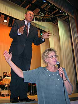 Алексей Моисеенко закатил концертв честь юбилея своей жены![]() Анатолий Каракчиев (слева) пытался выяснить у Валентины Жиделевой причину ее долгой жизни с одним и тем же мужем. Запевалой праздничного мероприятия в Коми республиканской филармонии в прошлый четверг, 2 сентября, в прямом и переносном смысле слова был народный артист РК, солист этого культурного учреждения Алексей Моисеенко. Он дал вечерний концерт в честь юбилея своей супруги Валентины Жиделевой. На торжество в филармонию можно было попасть либо по пригласительным билетам (похоже, так прошло большинство), либо за символическую для концерта плату в 50 рублей. Корреспонденты «ЗЖ» так и не поняли, кого из пришедших было больше – поклонников певца или его жены. Как бы там ни было, а семейное мероприятие собрало почти полный зал. У входа в филармонию гостей встречала сама «новорожденная» – в черном вечернем платье и наброшенной на плечи воздушной голубой накидке. Уже дали третий звонок, до выхода супруга на сцену оставались считанные секунды, а юбилярша все целовалась с продолжавшими подходить гостями. Мэр Сыктывкара Сергей Катунин опоздал. Появившись в фойе перед виновницей торжества и едва ли не перекрикивая поющего Алексея Моисеенко, г-н Катунин громко спросил: «Валя, ты что за концерты закатываешь?» Затем выразил пожелание, чтобы сцену для поздравления ему предоставили побыстрее, «поскольку в восемь надо уходить». Чуть позже г-н Моисеенко прервал выступление и несколько обескураженно сообщил, что «обстоятельства сложились так, что слово надо предоставить мэру».
