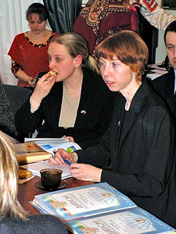 Сотрудницы американского посольства прилетели в Сыктывкар вечером праздничного дня 8 марта. Несмотря на усталость после перелета, дамы немедленно приступили к реализации довольно насыщенной программы своего пребывания в столице РК. Первая встреча имела неформальный характер и происходила в гостинице «Югор», куда поселили сотрудниц посольства. Вечерней аудиенции г-жи Грауэр и г-жи Бодоин удостоились председатель Коми правозащитной комиссии «Мемориал» Игорь Сажин и экс-главный редактор газеты «Молодежь Севера» Игорь Бобраков. Г-н Сажин по просьбе американок прокомментировал недавний закон о неправительственных организациях, а г-н Бобраков обрисовал ситуацию со свободой слова в РК, упомянув в том числе историю с отказом журналистам «МС» и «ЗЖ» в аккредитации при Желтом доме и госсовете РК и собственный уход с поста главреда «МС». В последующие два дня Кристин Грауэр и Сюзан Бодоин действовали, сообразуясь с официальной программой визита, утвержденной и.о. руководителя администрации главы и правительства РК Лилией Опариной. В четверг, 9 марта, сразу же после завтрака в гостинице, обеих сотрудниц посольства США ждали представительницы женского движения РК, а также глава минэкономразвития Коми Иван Стукалов. Встреча с лидерами женских организаций слегка затянулась, из-за чего гостьи чуть-чуть опоздали на встречу с представителями СМИ республики, устроенную Агентством РК по печати и массовым коммуникациям в недавно отремонтированном пресс-центре Дома печати. Руководитель вышеназванного агентства Надежда Боброва проинформировала американок о том, что в информационном пространстве РК действуют 180 «наименований изданий» и лишь 37 из них имеют государственную и муниципальную поддержку. Затем собравшимся представителям СМИ было предложено задавать вопросы. «Независимый журналист», как он сам себя отрекомендовал, Петр Малафеев, спросил: «Я брал интервью на полуострове Ямал у одного американского доктора и узнал с его слов, что в Америке работает только один член семьи. Мне интересно, чем занимаются ваши мужья?» Гостьи из США то ли не поняли вопроса, то ли поняли его превратно. Г-н Малафеев, которого попросили точнее сформулировать вопрос, дополнил его: «На свадьбе решается вопрос – кому работать?» Представительницы посольства наконец поняли, что от них хотят, и Кристин Грауэр открыла Америку: «По своему опыту могу сказать, что в американских семьях как мужья, так и жены обычно работают». «А что ваши мужья делают?» – попробовал вторгнуться в личную жизнь американок г-н Малафеев. Оказалось, что обе работницы посольства не замужем. Услышав это, независимый журналист пообещал незамужним американским девушкам найти мужей в Коми. «Мы изучим контингент», – пообещала г-жа Грауэр. Конечно же, иностранок спросили об их впечатлениях от Сыктывкара. «Вчера вечером мы совершили поход по городу, осмотрели его, и нас особенно поразили архитектура и та часть города, где еще сохранились деревянные постройки», – доложила г-жа Грауэр. Генеральный директор агентства «Комиинформ» Павел Кочанов довел до сведения посольских, что, по его мнению, «всем присутствующим было бы очень интересно повысить свои профессиональные знания» путем общения «с профессионалами с вашей стороны». Американки проявили заинтересованность в организации такого 