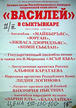 Альфию Коротаеву афишировали без спросу,но с двумя ошибкамиВ прошлую субботу, 11 марта, на сцене Республиканской филармонии были представлены лучшие песни республиканского конкурса современной коми песни «Василей». С момента своего создания в 1994 году фестиваль «Василей» «прописался» в Усть-Куломе, что понятно: праздник коми песни придумали три самодеятельных композитора из Усть-Куломского района, три Василия – Гущин, Лодыгин и Чувьюров. Впервые организаторы – три Василия и руководство филармонии – задумали переместить участников на сыктывкарские подмостки. Задумка обернулась скандалом: в афишах значилось выступление заслуженной артистки России Альфии Коротаевой, которую между тем никто петь не приглашал. Вдобавок ко всему фамилию певицы в афишах написали с двумя ошибками – «Каратаева».