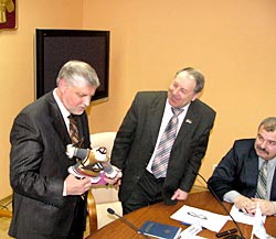У трапа прибывшего примерно в 10.00 самолета Ту-154 авиакомпании «Россия» г-д Миронова и Соколова встретили глава РК Владимир Торлопов, спикер госсовета РК Марина Истиховская, члены СФ от РК Игорь Васильев и Евгений Трофимов, мэр Сыктывкара Роман Зенищев, главный федеральный инспектор в РК Олег Алтухов. Г-н Миронов подошел к ожидавшим его в аэропорту представителям СМИ, в общении с которыми обозначил свое отношение к формированию региональных парламентов, назвав себя сторонником сохранения нормы 50х50 (половина – одномандатники, половина – по партспискам). «Партийный, не сомневаюсь, придет под красивыми лозунгами, но когда начнется работа, он будет регулярно отчитываться на съездах партии, но только не перед избирателями», – со знанием дела заявил корреспонденту «Комиинформа» лидер Российской партии жизни. После экспресс-общения с журналистами сопровождающий Сергея Миронова кортеж направился из аэропорта в парк культуры и отдыха имени С.М. Кирова: спикеру СФ предстояло посещение Республиканского центра дополнительного образования, на строительстве которого он побывал во время своего первого визита в РК летом 2004 года («ЗЖ», 26 июля 2004 года). Сергея Миронова там ждали. Во всех аудиториях центра кипела жизнь. В фойе спикера встретил фольклорный ансамбль, одним из солистов которого стал переодетый в шкуру медведя пляшущий артист. Некоторым гостям (Сергею Миронову, Владимиру Торлопову, его заместителю Ирме Кутаевой и министру образования и высшей школы РК Нелли Струтинской) тут же надели на головы берестяные обереги. Здесь г-ну Миронову преподнесли первый презент – коллаж по мотивам коми фольклора, выполненный из обоев и прочего подручного материала. «Это что – аппликация?» – не понял г-н Миронов. Для объяснений подозвали автора произведения. «Это – коллаж», – смутившись, ответила девушка. Спикер СФ еще внимательнее вгляделся в презент. «Ну, типа аппликации», – настоял на своем г-н Миронов и, поблагодарив за первое подношение, передал дар своему помощнику. Экскурсия по центру продолжилась. В какую бы аудиторию ни заглядывал высокий гость – всюду юные дарования демонстрировали бурную деятельность: пели, плясали, играли на эстрадных инструментах. Спикер СФ поддерживал ребят как мог: отбивал ритм ногой, аплодировал. Эстрадникам даже подпел. Заметив, что г-н Миронов духовно насладился, принимающая сторона направила гостя в банкетный зал, где предусмотрительно разожгли камин и накрыли стол. Угощения были представлены бутербродами-канапе, национальной выпечкой, конфетами и фруктами. Прямо перед носом спикера СФ оказалась бутылка бальзама «Олом вым». Впрочем, все это осталось нетронутым: Сергей Миронов осушил лишь чашечку чая. Перед тем, как покинуть центр, спикер успел оставить запись в гостевой книге («Счастливы дети, у которых есть такой дом творчества…»), запечатлеться с детьми на память и получить еще один подарок – национальный сувенир из оленьей шерсти. Процессия направилась в Сыктывкарский госуниверситет (СГУ). Перед тем, как выступить в студенческой аудитории, глава совфеда совершил короткую экскурсию в музей истории СГУ. Экскурсоводом выступила директор музея Майя Бурлыкина. Внимание Сергея Миронова привлек зал самоцветов. Он внимательно осмотрел экспонаты и, не дождавшись подарка, пообещал его сделать сам, сказав, 