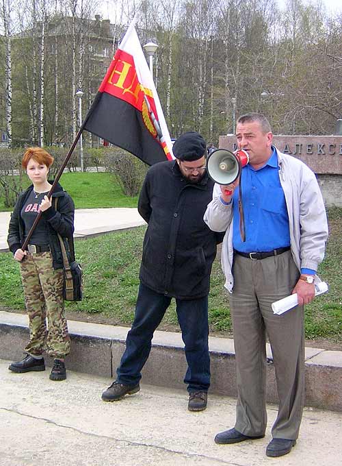 Националисты рассказали о «прекрасной деятельности» властей![]() На снимке корреспондента «ЗЖ» запечатлен фрагмент беседы главы РК Владимира Торлопова (слева) с Юрием Екишевым (справа), состоявшейся 17 июля 2005 года после праздничного открытия моста через Сысолу близ села Вотча. Через три с половиной месяца «Союз национального возрождения» под предводительством г-на Екишева провел свою первую акцию в Сыктывкаре. А 7 декабря, после того как депутаты госсовета РК по предложению президента РФ продлили полномочия г-на Торлопова в качестве главы РК на новый срок, последний, отвечая на вопрос одного из журналистов, сообщил, что намерен встретиться с г-ном Екишевым и «поговорить о проблемах, которые, с его точки зрения, существуют не только в РК, но и в стране». «Почему бы не принять сегодня его конструктивные, разумные предложения, а то, что у него наносное, будем вместе отсекать», - заявил глава представителям СМИ. Несмотря на намерения, г-н Торлопов так и не встретился с г-ном Екишевым. Фото Бориса Суранова. Вчера, в воскресенье, 21 мая, у памятника основоположнику коми литературы Ивану Куратову в Сыктывкаре прошел очередной митинг общественной организации «Союз национального возрождения» (СНВ). Послушать лидера СНВ, писателя Юрия Екишева, его активистов и сторонников из других общественных организаций националистического толка («Национал-державный путь России» (НДПР), «Движение против нелегальной иммиграции», коми правозащитная организация «Доръям асьнымос») собралось порядка полусотни человек. Городские власти, как это уже случалось со времени первого митинга СНВ, проведенного в начале ноября прошлого года, попытались воспрепятствовать националистам донести свои идеи до широких масс. Как сказал корреспонденту «ЗЖ» г-н Екишев, поводом послужила формулировка о целях акции в поданном в горадминистрацию уведомлении о проведении митинга. На сообщение о том, что СНВ собирается «привлечь внимание общественности к проблемам формирования власти», к полной ее «неспособности решить проблемы социальной защиты, национального вопроса, нелегальной иммиграции, распродажи народного достояния, препятствия распространению наркотиков», из мэрии пришел ответ за подписью градоначальника Сыктывкара Романа Зенищева: «Администрация МО «г.Сыктывкар» считает, что проведение публичного мероприятия с указанной в уведомлении целью противоречит действующему законодательству и является недопустимым как нарушающее права граждан. Исходя из вышеизложенного, администрация предупреждает вас о том, что вы можете быть привлечены к ответственности в установленном порядке». Рассудив, что решение о законности или незаконности публичного мероприятия может принять только суд, Юрий Екишев отправил в горпрокуратуру соответствующее заявление, а в администрацию Сыктывкара – еще одно уведомление, в коем целью акции обозначил уже доведение до общественности информации о «прекрасной деятельности городской и республиканской администраций на благо народа». Возражений из сыктывкарской мэрии не последовало, и митинг состоялся. Постоянным участникам мероприятий СНВ не могло не броситься в глаза практически полное отсутствие милиции, которая ранее не оставляла своим вниманием митинги «Союза национального возрождения» – вплоть до задержания его активист