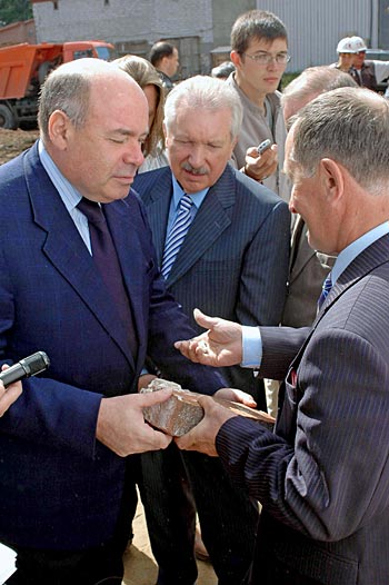 Тем временем на самой стройке Михаила Швыдкого «грузили» информацией. Основными докладчиками по вопросу сноса исторических памятников выступили актер, режиссер и заведующий постановочной частью драмтеатра, ныне подрабатывающий сторожем на строительном объекте компании «Лига Строй» Виктор Градов, а также заместитель министра архитектуры, строительства и коммунального хозяйства РК Вячеслав Козъяков. Беседовать о культуре мешали усилившиеся вместе с приездом VIPов строительные шумы. Глава РК распорядился, чтобы громкость убавили. Когда стало чуть тише, г-ну Швыдкому дали подержать раритетный кирпич, оставшийся от снесенного памятника культурного наследия.