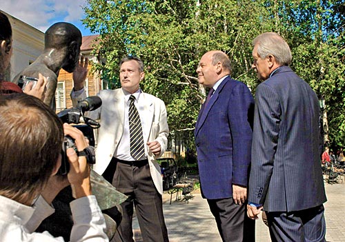 Михаилу Швыдкому подарили бутылкус репродукцией картины на месте этикетки![]() Михаил Швыдкой признался, что плохо знает историю коми народа. Фото «ЗЖ». На минувшей неделе в Республике Коми ровно сутки провел руководитель Федерального агентства по культуре и кинематографии, ведущий разнообразных программ на российском ТВ Михаил Швыдкой. Пресс-служба главы РК и правительства РК назвала этот визит рабочим, хотя местами пребывание г-на Швыдкого в РК носило, прямо скажем, неформальный характер. Глава культурно-кинематографического агентства (подчиняется Министерству культуры и массовых коммуникаций РФ – «ЗЖ») прилетел в Сыктывкар вечером в пятницу, 4 августа, обычным рейсовым самолетом в сопровождении заместителя начальника управления современного искусства Федерального агентства по культуре и кинематографии Александра Заволокина и своего пресс-секретаря Натальи Уваровой. Делегацию федеральных чиновников у трапа самолета встретили глава РК Владимир Торлопов и его заместитель Алексей Чернов, имеющий к культуре самое непосредственное отношение (г-н Чернов – сын питерского режиссера Леонида Менакера и актрисы Аллы Черновой – «ЗЖ»). В ходе короткого подхода к прессе г-на Швыдкого спросили, зачем он приехал. Гость поблагодарил за приглашение и сообщил: «Чтобы решить в том числе вопрос с реконструкцией театра имени Виктора Савина, вокруг которого начались арбитражные споры». Но прежде чем решать такие серьезные вопросы, гостям предложили отдохнуть с дороги. Кортеж по устоявшейся традиции направился в загородную правительственную резиденцию в Лемью, более известную как «Домик Путина», где, к слову, чуть больше трех месяцев назад гостил непосредственный начальник Михаила Швыдкого – министр культуры и массовых коммуникаций РФ Александр Соколов. Г-н Соколов тогда, как известно, остался доволен оказанным гостеприимством, даже поиграл на дорогом рояле Bekker и позабавился с 4-летней медведицей Машкой, сидевшей в клетке на территории резиденции и служившей утехой для отдыхающих там VIPов. О том, чем развлекали в Лемью г-на Швыдкого, история умалчивает. Наутро 5 августа гости приступили к реализации программы визита. Ее по ходу пришлось немного скорректировать, из-за чего выпало ранее запланированное посещение Дома купца Суханова. Осмотр культурных достопримечательностей начался с Финно-угорского культурного центра, которому по просьбе главы РК, высказанной им при личной беседе с президентом РФ Владимиром Путиным 6 апреля, собираются придать статус федерального. Во время этого и других субботних мероприятий г-на Швыдкого сопровождали, помимо г-д Торлопова и Чернова, министр культуры и национальной политики РК Надежда Боброва и ее первый заместитель Валерий Коробов. Всю делегацию в финно-угорском центре встретили руководитель департамента по делам национальностей РК Евгений Рожкин и директор центра Светлана Белорусова. Короткая экскурсия завершилась показом мультимедийного продукта, рекламирующего сайт финно-угорских народов, а также фольклорным концертным номером, после которого г-дам Швыдкому, Торлопову и г-же Бобровой подарили по деревянной ложке. Далее высокопоставленные персоны удалились на 2-й этаж поговорить о неких финансовых аспектах придания центру статуса федерального. Пресекать проникновение в эту комна