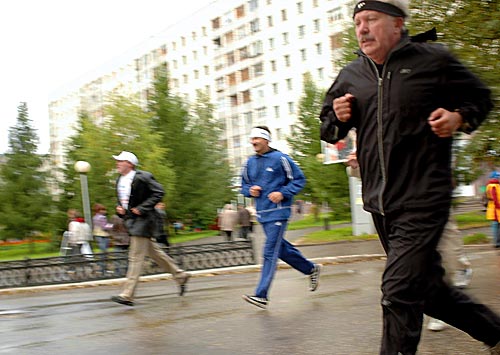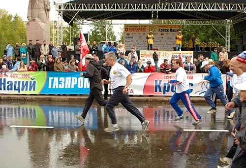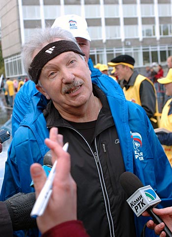 Владимир Торлопов призвал всех бегатьвместо того, чтобы пить водку и ходить на митинги![]() Владимир Торлопов пожелал молодежи бегать вместо того, «чтобы ходить в магазин за бутылкой водки, вина и так далее». Фото «ЗЖ». В рамках проведенной вчера, 17 сентября, всероссийской партийно-спортивной акции с весьма странным названием «Кросс Наций» на старт в Сыктывкаре вышло сразу несколько тысяч бегунов. По сведениям «ЗЖ», для того, чтобы обеспечить столь невиданную явку, руководители города совместно с функционерами Коми регионального отделения партии «Единая Россия», как в старые советские времена, отправили разнарядки на предприятия, в организации и учебные заведения столицы республики. Каждой школе, каждому профучилищу, каждому вузу, каждому более или менее крупному предприятию, а уж тем более - бюджетной организации было указано, сколько бегунов должно быть выставлено для участия в кроссе. За десять минут до полудня на установленную возле памятника Ленину на Стефановской площади сцену вышел глава РК Владимир Торлопов. Его речь-экспромт в основном состояла из пожеланий молодежи, часть которой к тому времени готовилась к старту прямо напротив сцены. Глава Коми, в частности, пожелал молодому поколению «заниматься поддержкой своего здоровья вместо того, чтобы ходить в магазин за бутылкой водки, вина и так далее…Лучше бегать и себя носить, чем бутылку в руках как соску-присоску ко рту подносить или живот свой носить впереди себя». Еще г-н Торлопов пожелал детям и учащимся того, «чтобы ни у кого не было живота, чтобы были стройные, подтянутые и чтобы потомки, которые появятся в результате того, что вы женитесь, выйдете замуж, были здоровы в России и в Республике Коми». Заканчивая выступление, глава предложил в следующий раз устроить бег на выносливость – бежать два или три часа. Поскольку акция проводилась «единороссами», то следующей выступила председатель госсовета РК, секретарь политсовета КРО партии власти Марина Истиховская. После того, как г-жа Истиховская пожелала всем удачного старта, ее сменил мэр Сыктывкара, член республиканского политсовета «Единой России» Роман Зенищев. По его словам выходило, что кросс – это труд. Во всяком случае, градоначальник поздравил всех «с праздником, с праздником труда». Затем к микрофону вновь подошел глава РК и, объявив «Кросс Наций» в республике открытым, вновь высказал пожелание брать «пример с главы республики – лучше бегать и быть здоровым, чем пить водку или спиртные напитки и потом устраивать различного рода шествия и митинги». После того, как судьи отправили со старта школьников, в стартовых воротах появились участники VIP-забега, которым предстояло осилить километр. Главным бегуном здесь, конечно, был Владимир Торлопов. В числе прочих кросс бежали начальник управления федеральной службы по контролю за оборотом наркотиков РФ по РК Ярослав Карташевич, начальник управления ФСБ по РК Николай Пиюков, мэр Сыктывкара Роман Зенищев и чиновники самого разного калибра из Желтого дома, госсовета и горадминистрации. Корреспонденту «ЗЖ» показалось, что многие из них предстоящему забегу не очень рады. Перед стартом глава Коми (с черной повязкой на лбу) попозировал фотокорреспондентам. Фото «ЗЖ». Спустя несколько секунд после старта подозрения подтвердились. Сначала вперед вырвался 56-летни