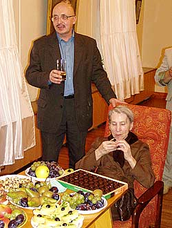 На открытие пришло большое количество людей – творческая элита Коми, друзья, студенты и просто сочувствующие. Прибывший заранее со свитой и цветами председатель Госсовета РК Иван Кулаков, по сообщению директора галереи Валерия Коробова, помогающий галерее не столько словом, сколько делом, произнес поздравительную речь первым. Затем Владимира Ремовича с юбилеем, а Елену Федоровну с открытием выставки поздравила министр культуры РК Мария Кузьбожева. Сама г-жа Кузьбожева на празднике присутствовать не смогла по причине командировки, поэтому свои поздравления передала через зама. Потом еще некоторое время выступали и дарили подарки друзья Владимира Ермолина по художественному цеху и организаторы выставки. После того, как отзвучали официальные поздравления, народ двинулся в выставочный зал. До сих пор работы Ермолиных демонстрировались порознь, поэтому эта выставка стала первым в истории семьи совместным мероприятием такого масштаба. Посетители увидели портреты и тематические работы недавно ушедшего из жизни Рема Ермолина, натюрморты его жены и пейзажи сына. На смену скоро откланявшемуся г-ну Кулакову пришел председатель столичного горсовета Владимир Пыстин. Г-н Ермолин долго водил его по двум выставочным залам, они делились впечатлениями, а затем синхронно с расходящейся публикой последовали в кулуары, где для избранных участников выставки и журналистов был устроен дружеский банкет. Иван Костин |