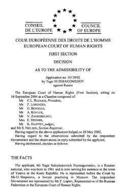 На сегодняшний день на Россию в Страсбургский суд пожаловались 18,5 тысячи жителей нашей страны, и пока лишь по 12 жалобам вынесены решения в пользу заявителей. Зек из колонии № 35/2 учреждения М-222, находящейся в городе Емва Княжпогостского района РК, попал в список жалобщиков следующим образом. До 1991 года Тагир Нурмагомедов с женой и тремя детьми жил у себя на родине – в дагестанской деревне Джавгат. В апреле 91-го Кочубеевский народный суд Ставропольского края признал его виновным в ограблении и приговорил к восьми годам лишения свободы. Как следует из поданной в Европейский суд жалобы осужденного, сомневаться в объективности и беспристрастности судебной машины России он стал еще во время своего выступления перед составом суда. Когда ему предоставили слово, судья Шматченко во весь голос стала обсуждать с заседателями преимущество украинского борща перед русским. При этом, как пишет осужденный, 300 листов уголовного дела суд умудрился рассмотреть фактически за три часа. После чего отправил Тагира Нурмагомедова в исправительную колонию № 350/1 близ Печоры. За три года осужденный Нурмагомедов зарекомендовал себя только с положительной стороны, а потому за «примерное поведение и образцовую работу» администрация учреждения 14 марта 1994 года предоставила ему краткосрочный отпуск на родину. Страсбургским судьям г-н Нурмагомедов написал, что в родной деревне его ждала ужасающая картина: за три года его супруга стала инвалидом, а дети постоянно болели – от регулярного недоедания и отсутствия медицинской помощи. Тревожила и сложная обстановка в соседней Чечне. Учитывая все это, Тагир Нурмагомедов принял сознательное решение в колонию не возвращаться. Стремясь обезопасить семью, он перевез ее в город Губкинский Тюменской области, где в августе 1995 года легализовался, получив в местном отделении милиции паспорт с пропиской, а позже – зарегистрировался частным предпринимателем. Здесь же г-н Нурмагомедов спустя время получил индивидуальный номер налогоплательщика и, купив квартиру, оформил ее на свое имя. Небольшие доходы от своего дела даже позволяли ему оказывать посильную помощь местным сиротам. Вполне легальная и деятельная жизнь шла своим чередом до тех пор, пока в администрации колонии вдруг не вспомнили о невозвращенце. Произошло это через пять лет после того, как Тагиру Нурмагомедову был предоставлен отпуск – весной 1999 года. В колонии приступили к расследованию причин побега и практически сразу беглеца объявили в федеральный розыск. Сам он узнал про это 29 августа 2000 года, когда его вызвали в Губкинскую милицию и тотчас взяли под стражу. По этапу Тагира Нурмагомедова вернули в Печору, где в ноябре местный суд к неотбытому сроку добавил ему за несвоевременное возвращение из отпуска еще шесть месяцев. Этапирование г-н Нурмагомедов так же подробно расписал в жалобе Европейскому суду. Обращение с ним он характеризовал как «бесчеловечное» – еще в Тюмени его избили сотрудники тамошнего СИЗО. Позже осужденного доставили в одно из воркутинских учреждений, где в камере площадью 17,5 метра содержались 28 человек. Затем был изолятор временного содержания Печоры – в камере без воды и туалета, зато с клопами, тараканами и вшами. Уже этапированный в емвинскую колонию, где находится и по сей день, Тагир Нурмагомедов пытался обжаловать при