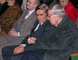 Кто не знает, местечковый поначалу праздник «самодельной» коми песни придумали в 1994 году три доморощенных композитора из Усть-Куломского района, три Василия – Гущин, Лодыгин и Чувьюров. Уже на следующий год власть проявила интерес к инициативе «трех Василеев» – фестиваль посетили высокие гости из руководства республики, в том числе и председательствовавший тогда в Госсовете РК нынешний Глава РК Владимир Торлопов. С тех пор такие посещения стали регулярными, а у г-на Торлопова появилась традиция – на обратном пути из Усть-Кулома в Сыктывкар останавливаться на трассе и встречать старый Новый год стаканчиком шампанского. Собственно «Василей-2005» начался в районном Доме культуры вечером 13 января. Но уже днем на втором этаже РДК публику начали «разогревать» самодеятельные фольклорные коллективы, а в фойе шумела ярмарка. В ожидании фестиваля желающие могли прокатиться на конной упряжке вокруг елки перед домом культуры. Три извозчицы брали с детей по 5 рублей, со взрослых – вдвое больше. Корреспондент «ЗЖ» заплатил 40 руб., и его прокатили по главной улице Усть-Кулома. Заметно больше, чем лошадей, у РДК скопилось милиционеров. Местная молодежь с надувными шариками и почему-то березовыми вениками в руках вела себя в отношении правоохранителей крайне вызывающе. «Купите веник», – предлагал сельский тинэйджер землякам-милиционерам. «Да вы вообще обнаглели! – отгоняли шпану озябшие стражи местного порядка. – Вон, лошадей покормите, они голодные…» В двадцати метрах от дома культуры в это время совсем еще юные устькуломцы старательно забивали снегом выхлопные трубы автобусов, привезших гостей и участников фестиваля. Милиция между тем занималась и прямым своим делом. От ее внимания, в частности, не ускользнуло, что куртка корреспондента «ЗЖ» подозрительно оттопырена на животе. После пояснений, что там спрятан от холода фотоаппарат, а не бомба, правоохранитель высказал неожиданное в этих глухих местах предположение: «А вдруг там у тебя пояс шахида?» И успокоился окончательно, когда досмотренный им корреспондент признал, что угроза терроризма реальна как никогда. За час до начала «Василея» в фойе было не протолкнуться, хотя на ярмарочных столах ничего особенного (пожалуй, кроме печатной продукции Коми книжного издательства) не было. Наверное, народ толпился просто в ожидании праздника. И ничто не могло помешать ему делать это. Даже миазмы из туалета, где произошла аварийная утечка. Когда начался фестиваль, заметно запахло и в переполненном зале, где присутствовало не меньше 400 человек (в том числе – Глава РК Владимир Торлопов, его главный консультант Владимир Осипов, председатель общественного движения «Коми войтыр» и по совместительству член Правительства РК Валерий Марков, а также исполняющий ныне обязанности председателя Госсовета РК Алексей Безносиков). Двери в фойе закрыли, фестивальный климат нормализовался, и уже ничто не мешало ни зрителям, ни участникам наслаждаться действом. А оно действительно впечатляло. В первую очередь – естественностью всего, что показывалось. Признаков «ведомственной» режиссуры, свойственных многим квази-народным представлениям, не чувствовалось. Хотя свой, самодеятельный сценарный план у «Василея» все же имелся – с десяток листов был прикреплен скотчем на стене в кулуарах. Согласно этому с